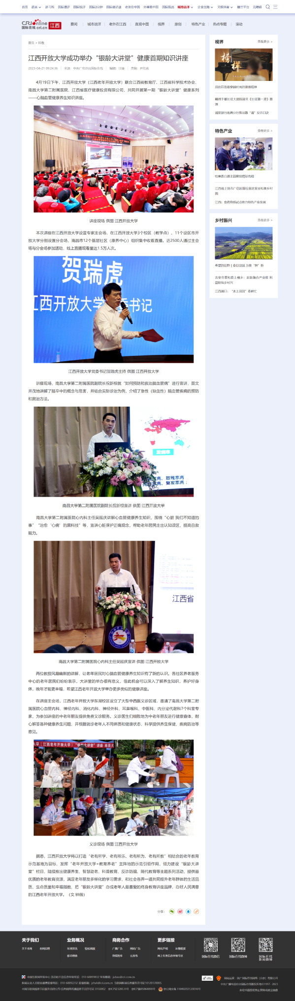 4月19日下午,江南官方体育官方入口(China)官方网站(江西老年开放大学)联合江西省教育厅、江西省科学技术协会、南昌大学第二附属医院、江西省医疗健康投资有限公司,共同开展第一期“银龄大讲堂”健康系列——心脑血管健康养生知识讲座。