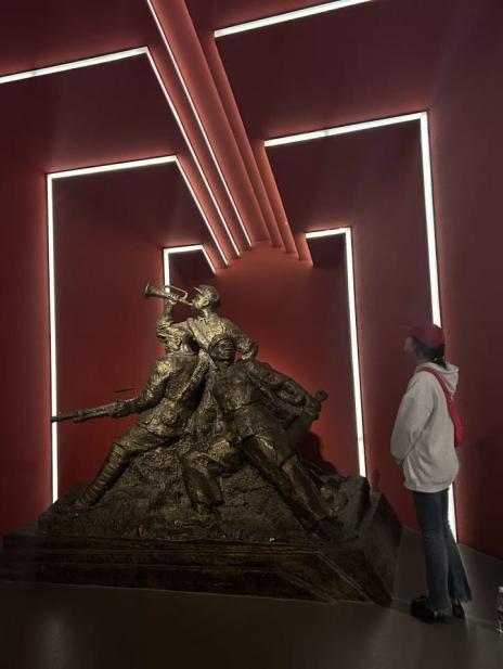 在课余的下午,我来到了南昌建军雕塑广场,它临赣江边而建,船只在江面行驶,几组生动形象的铜雕,让我感觉自己瞬间穿越至战火纷飞的实景中,与他们对话,和他们共同奋战,向他们致敬!——22 电商 1 班 吴婷霞
