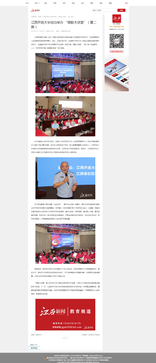 为进一步提升老年居民对各类诈骗行为的鉴别力和防范力,切实提高老年人依法维权和自我保护意识,近日,江南官方体育官方入口(China)官方网站(江西老年开放大学)联合江西省社区教育指导中心、江西省科学技术协会和赣州市公安局,共同开展“银龄大讲堂”(第二期)权益系列——“防范养老诈骗 安享银龄生活”知识讲座。
