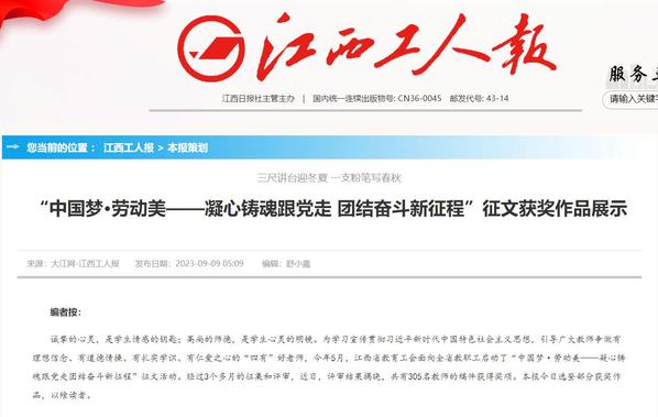 为庆祝39个教师节,江西省教育工会面向全省教职工启动了“中国梦·劳动美——凝心铸魂跟党走团结奋斗新征程”征文活动,我校教师陈志宏的作品《只为那转身后的惦念》获得本次大赛高校组特等奖。近日,《江西工人报》刊登此作品。