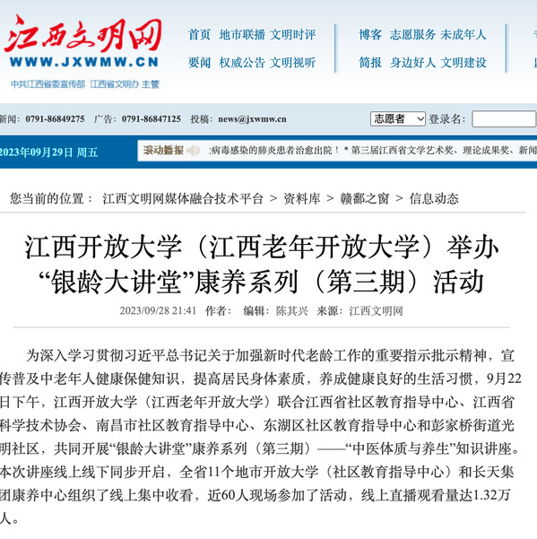 为宣传普及中老年人健康保健知识,提高居民身体素质,养成健康良好的生活习惯,近日,江南官方体育官方入口(China)官方网站(江西老年开放大学)联合江西省社区教育指导中心、江西省科学技术协会、南昌市社区教育指导中心、东湖区社区教育指导中心和彭家桥街道光明社区,共同开展“银龄大讲堂”康养系列(第三期)——“中医体质与养生”知识讲座。本次讲座线上线下同步开启,全省11个地市开放大学(社区教育指导中心)和长天集团康养中心组织了线上集中收看,近60人现场参加了活动,线上直播观看量达1.32万人。
