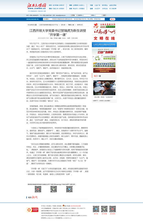 9月27日下午,江南官方体育官方入口(China)官方网站党委书记贺瑞虎以《技能铸就辉煌 立志报效祖国》为题,通过“线上+线下”相结合的方式,为西湖校区和青云谱校区的新生学子同步带来了一堂紧贴时代、别开生面的“开学第一课”。新生代表、各二级学院领导、辅导员、思政教师及新入职教师共计160人现场聆听。