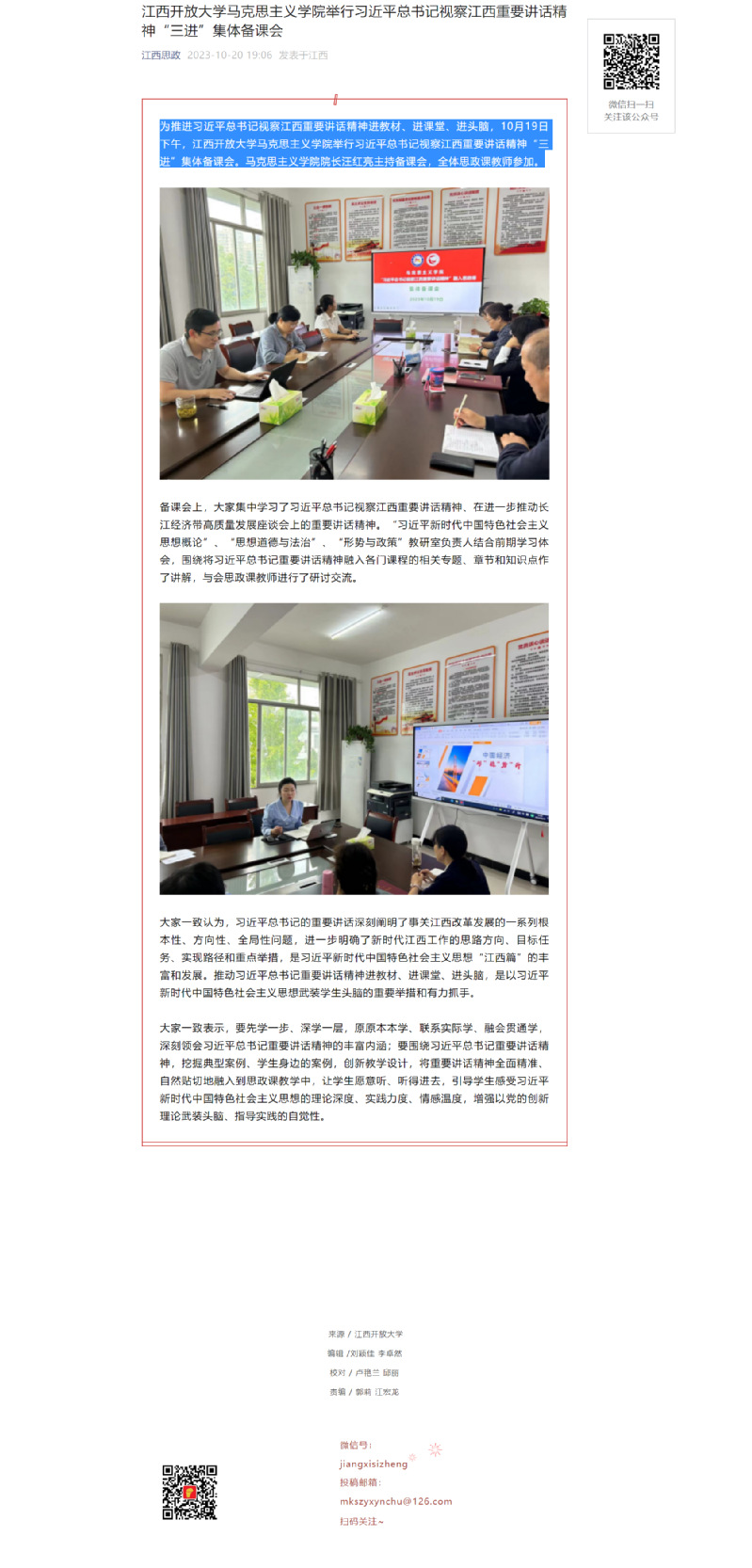 为推进习近平总书记视察江西重要讲话精神进教材、进课堂、进头脑,10月19日下午,江南官方体育官方入口(China)官方网站马克思主义学院举行习近平总书记视察江西重要讲话精神“三进”集体备课会。马克思主义学院院长汪红亮主持备课会,全体思政课教师参加。