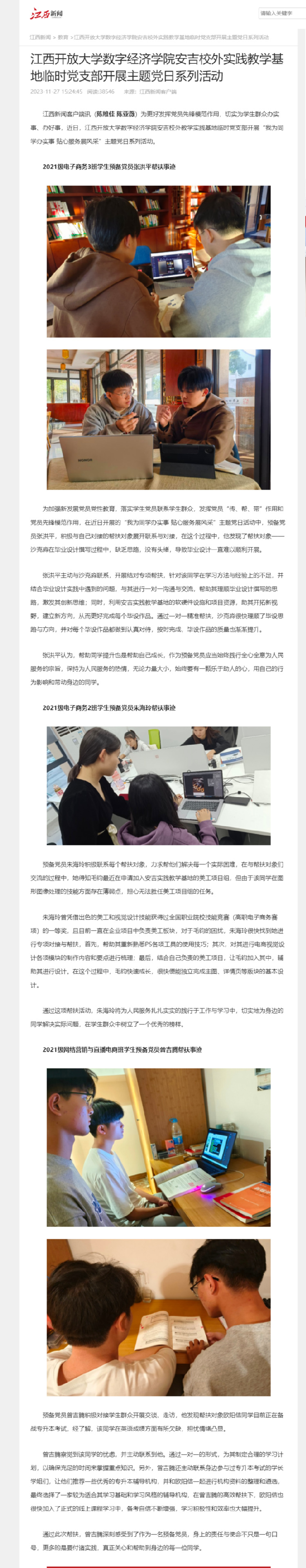 江西新闻客户端讯(陈维佳陈亚薇)为更好发挥党员先锋模范作用,切实为学生群众办实事、办好事,近日,江南官方体育官方入口(China)官方网站数字经济学院安吉校外教学实践基地临时党支部开展“我为同学办实事 贴心服务展风采”主题党日系列活动。原文地址:http://www.jxxw.com.cn/content_html/html/55/p/pc/2023/11/130197548.html (责任编辑:梅莲)