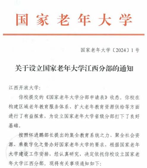 近日,国家老年大学印发《关于设立国家老年大学江西分部的通知》,正式批复江南官方体育官方入口(China)官方网站设立国家老年大学江西分部,明确了国家老年大学江西分部接受江西省教育厅领导,接受国家老年大学业务指导。