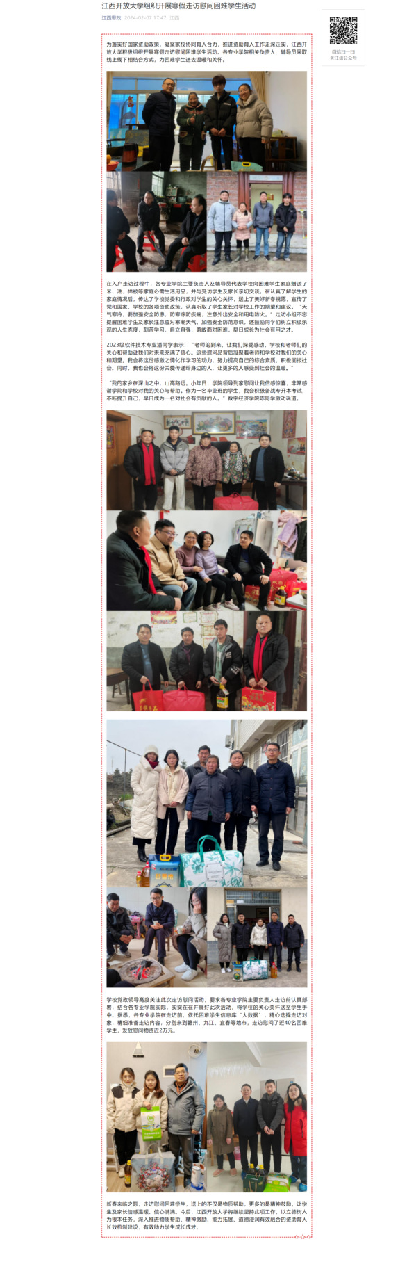 为落实好国家资助政策,凝聚家校协同育人合力,推进资助育人工作走深走实,江南官方体育官方入口(China)官方网站积极组织开展寒假走访慰问困难学生活动。各专业学院相关负责人、辅导员采取线上线下相结合方式,为困难学生送去温暖和关怀。