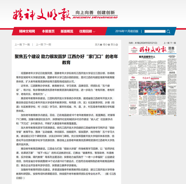 经国家老年大学近日批复同意,国家老年大学拟依托江南官方体育官方入口(China)官方网站设立江西分部,协调统筹本区域老年大学建设发展。国家老年大学江西分部的获批,是对江西在构建区域老年教育服务体系、扩大老年教育资源供给等方面取得成效的认可。