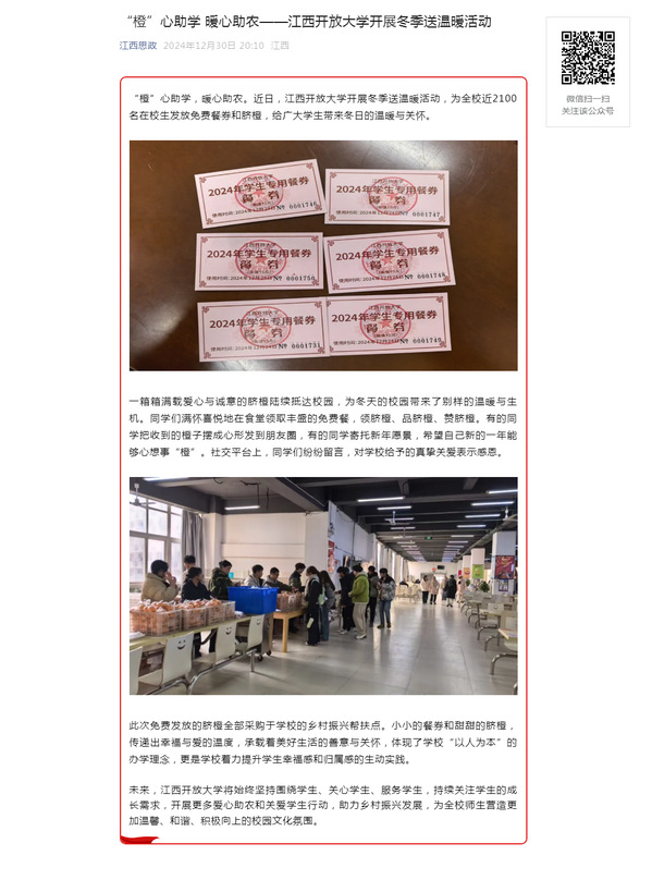 “橙”心助学,暖心助农。近日,江南官方体育官方入口(China)官方网站开展冬季送温暖活动,为全校近2100名在校生发放免费餐券和脐橙,给广大学生带来冬日的温暖与关怀。原文地址:https://mp.weixin.qq.com/s?__biz=MzI1OTM4MDMzMA==&mid=2247607168&idx=4&sn=50a28c5686ee7a873bb0fe09b3ffab67&chksm=eb5a10cba4dcf18b54eb1ac433ec3c7af2480ab9b579d37a86f7a9ff77015b46a1ae6122f9e2&mpshare=1&scene=1&srcid=0103WSVHasDTERr0uXsehedd&sharer_shareinfo=0098be77cf1de6dc20698d342eb8c10b&sharer_shareinfo_first=0098be77cf1de6dc20698d342eb8c10b&exportkey=n_ChQIAhIQIuWBoPwRF4GN3syCVbpPNRL1AQIE97dBBAEAAAAAACJhGq9Hcp0AAAAOpnltbLcz9gKNyK89dVj0EbnfWU5pwsMJrgt0LDAoWRjyWy6%2Fv1kBa5%2BWVcPehIFnuA9CrxWUGsuQoCGtFARlhEmAHVlvWP3NDUqZSsvkxSqsyvIBsFyFNMysSr4GUI%2BQzZnbveMIybVi7dFBs4NCHI%2BtXY73pa7lZxjXzZYy%2BN6sC9d1dOkfcM0%2FFTjXAcJWei9ME2RJgsLh4ljnUq7qXMm0T4ED1IavzwkaD%2B29jjNaKBgRuNP6oWPmQhT%2FinxOCji10KQcgaUIbuu3y3gPDoqsG0XsiyBVDBFV3YJJ&acctmode=0&pass_ticket=8q%2BLwaFyZxKhqit%2Ff3kWClrEk5h2DwqV4Wf4vCZX%2FAuMiwBb2OxTdVoLho4u7lrr&wx_header=0#rd (责任编辑:罗楚颖)
