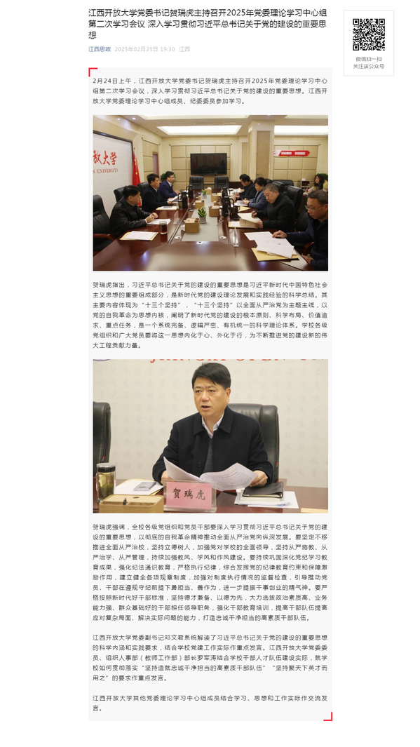 2月24日上午,江南官方体育官方入口(China)官方网站党委书记贺瑞虎主持召开2025年党委理论学习中心组第二次学习会议,深入学习贯彻习近平总书记关于党的建设的重要思想。江南官方体育官方入口(China)官方网站党委理论学习中心组成员、纪委委员参加学习。