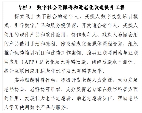 1.优化完善数字资源获取渠道。加快千兆光网、5G网络、IPv6等新型基础设施建设部署,不断拓展网络覆盖范围、提升网络质量,提高数字设施和智能产品服务能力。加大适老化智能终端供给,推进互联网应用适老化改造。加快推动信息无障碍建设,打造推广数字化助残服务,运用数字技术为残疾人生活、就业、学习等增加便利。支持少数民族语言语音技术研发应用。有序引导科研院所、普通高校和职业院校、企业机构、团体组织、高端数字人才等发挥自身优势,开发设立数字素养与技能培训网站、移动应用程序和公众账号等,为数字资源提供多样化获取渠道。