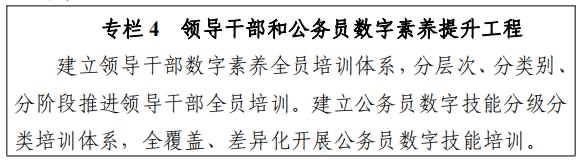13.提升领导干部和公务员数字治理能力。加大领导干部和公务员信息化培训力度,丰富数字经济、数字社会、数字政府等领域线上培训资源,把提高党员领导干部数字治理能力作为各级党校(行政学院)的重要教学培训内容。引导领导干部和公务员运用网络了解民意、开展工作,提升学网、懂网、用网的能力。在公务员选拔任用中,加强数字能力方面的考察。