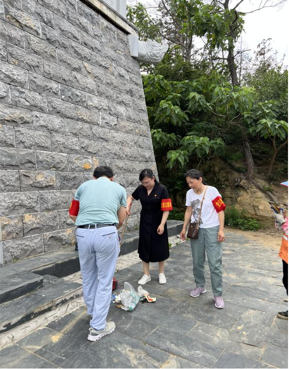 随后,大家一起来到南昌湾里矿坑公园开展志愿服务。该公园原先是一座满目疮痍、岩石裸露、有地质灾害隐患,生态环境遭到严重破坏的废弃采石场。近年来,政府启动了“焕然重生的体验地”复绿工程,清理危险岩石、种植草皮、疏通山体水系……一项项举措将“城市伤疤”华丽变身为生态公园。为了用实际行动传递健康、低碳、环保的理念,机关党委欧阳萍书记、二支部熊江鹏书记、三支部黄宗勇书记、四支部李春湖书记、九支部上官小红书记及其他党员佩戴党员志愿者袖章,沿着上山之路边走边捡拾登山游客随手抛弃的矿泉水瓶、纸巾,虽然天气炎热,但是也没能阻挡大家志愿服务的步伐。